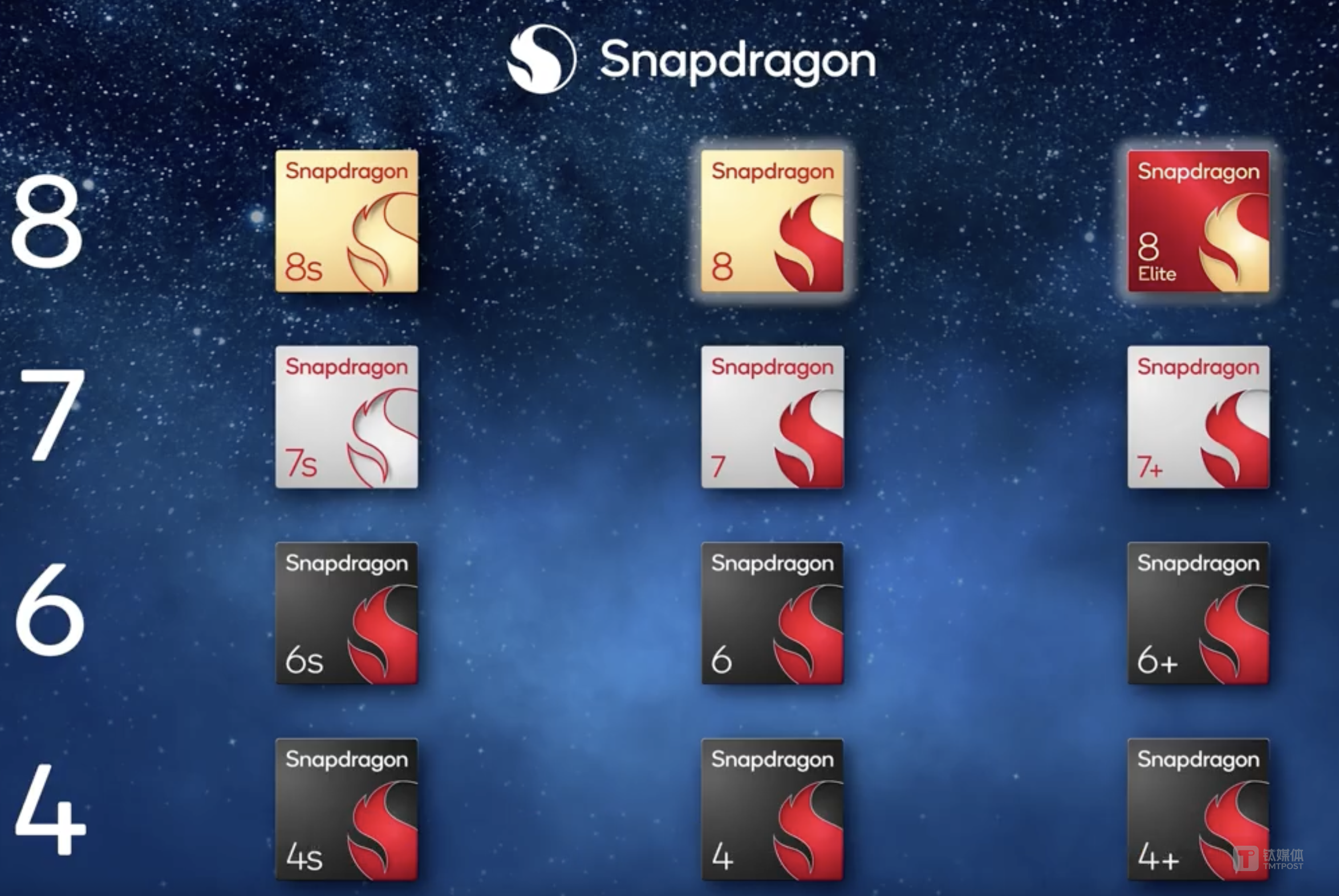 其中,骁龙7系、6系和4系都提供了多样化的选择,包括实现代际性能提升和卓越技术的标准版,它是每个系列的核心产品。带来突破性表现的Plus层级,以及通过精选特性契合用户需求的s层级。